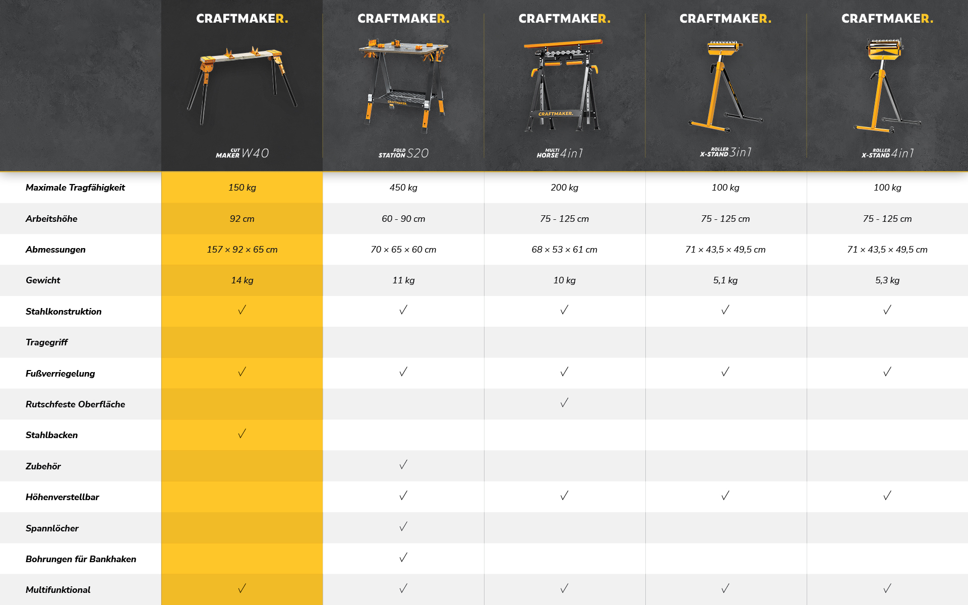 CRAFTMAKER® wird Sie mit dem, was es kann, ansprechen, und das ist definitiv nicht wenig. Sein Bereich sind multifunktionale, faltbare Arbeitstische, verschiebbare Rollunterstützungen, Wandhaken und leicht kombinierbares Zubehör. Qualität und Robustheit zu fairen Preisen beschreiben diese Marke am besten. Wenn Sie Mobilität, Praktikabilität und viele praktische Lösungen suchen, dann setzen Sie auf Craftmaker, und die Arbeit wird Ihnen leicht von der Hand gehen.