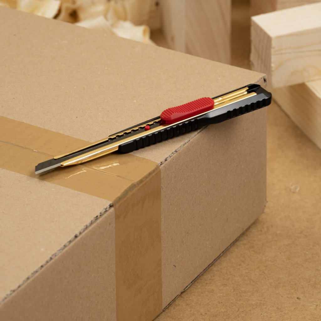 Hochwertiges, japanisches ausziehbares Cuttermesser für den normalen Arbeitseinsatz. Geeignet zum Schneiden von Karton, Verpackungsmaterial, Gummi und mehr. Gehärtete Metallführung mit erhöhter Haltbarkeit und mattvergoldeter Oberfläche. Extrem scharfe, austauschbare japanische Klinge. Hergestellt in Japan.