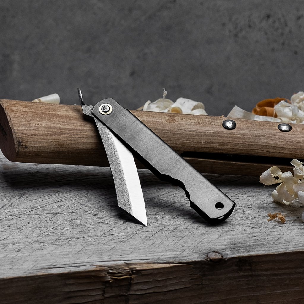 Der bei Higonokami-Messern verwendete Kohlenstoffstahl ist bewusst nicht rostfrei. Der entscheidende Vorteil gegenüber rostfreiem Stahl ist die überlegene Schärfe und Schnitthaltigkeit. Eine Klinge aus Kohlenstoffstahl lässt sich feiner ausschleifen und behält ihre Schärfe deutlich länger.