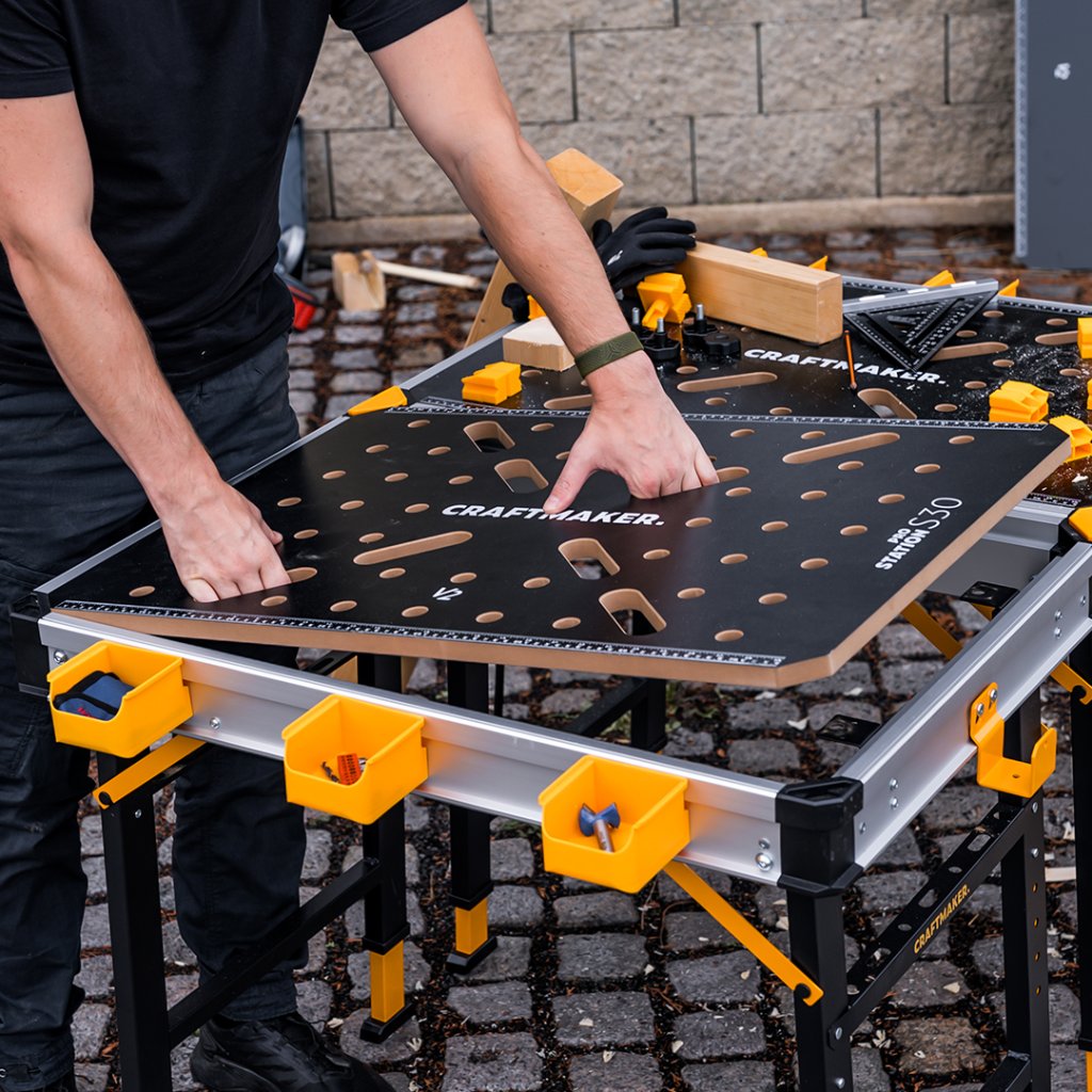 Der beliebte Arbeitstisch Pro Station S30 ist jetzt in der neuen, verbesserten Version V2 erhältlich. Die laminierte MDF-Arbeitsplatte ist dank Stahlgewinden und Sterngriffschrauben vollständig abnehmbar, sodass Sie sie bei Bedarf jederzeit schnell austauschen können. Sie möchten eine feste Arbeitsfläche ohne Löcher? Für den Tisch können Sie jetzt auch eine Ersatzplatte ohne Bohrungen erwerben. Haben Sie Ihre ursprüngliche Platte durch intensive Arbeit beschädigt? Kein Problem – wir haben sie ebenfalls im Sortiment. Wechseln Sie Ihre Arbeitsfläche je nachdem, was Sie gerade benötigen. Im Lieferumfang ist eine Platte mit Löchern für Bench Dogs und Zwingen enthalten. Die geschlossene Platte kann separat erworben werden.