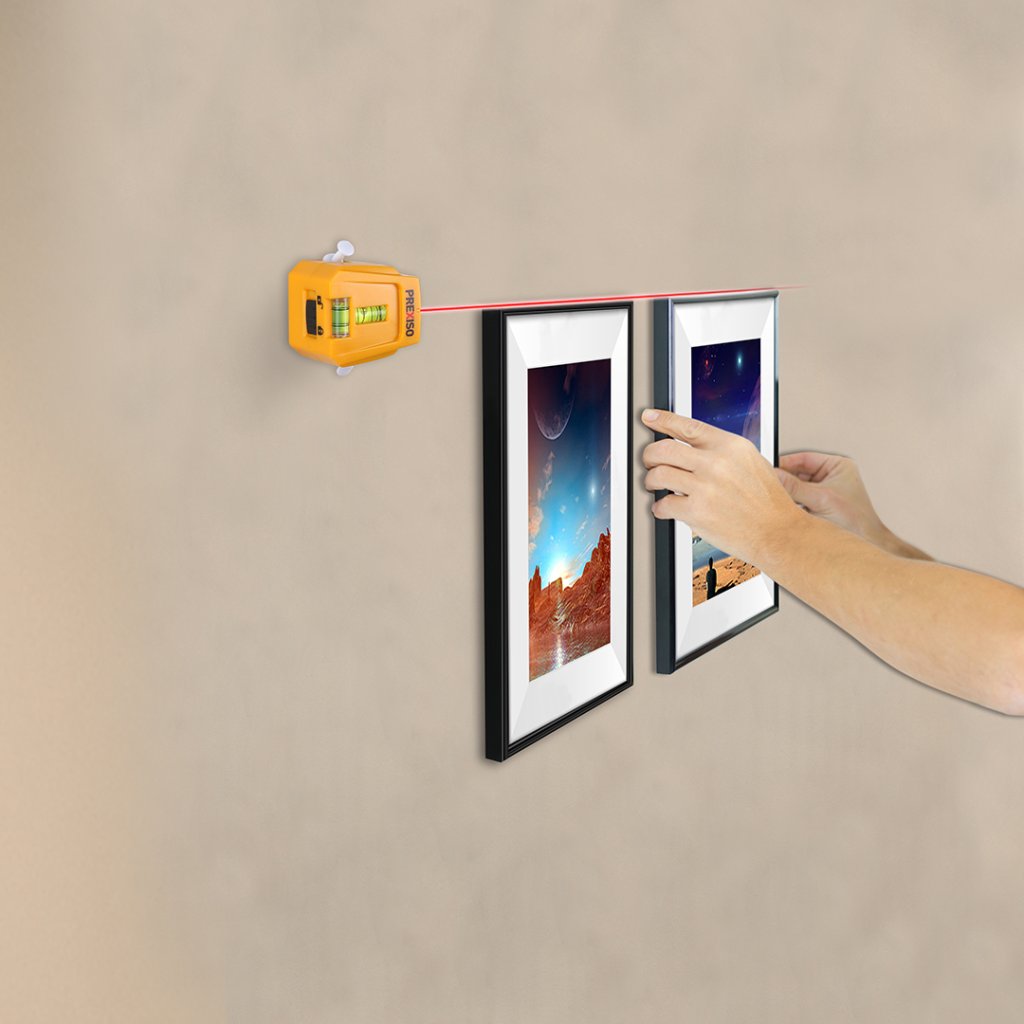 Das PREXISO Laser-Nivelliergerät und Linienmarkierer, das durch zwei Löcher an der Wand befestigt werden kann. Ein Werkzeug ähnlich einem Linienmarkierer, aber mit dem Vorteil, dass Sie die Linie nach dem Markieren nicht löschen müssen, wenn Sie sauber arbeiten.